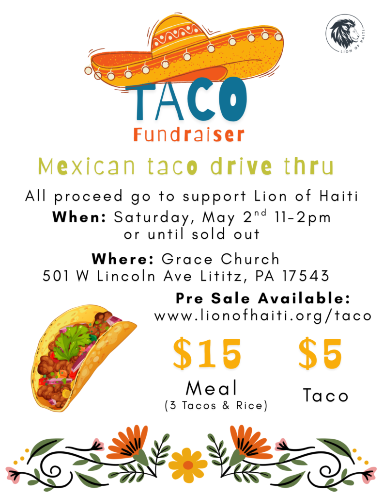 Skip the lunch lines in downtown Lititz and drive thru for a cause! Join us on Saturday, May 2nd, at Grace Church for fresh, delicious Mexican tacos. Whether you’re heading to the park or coming home from the morning markets, grab a meal that makes a difference.